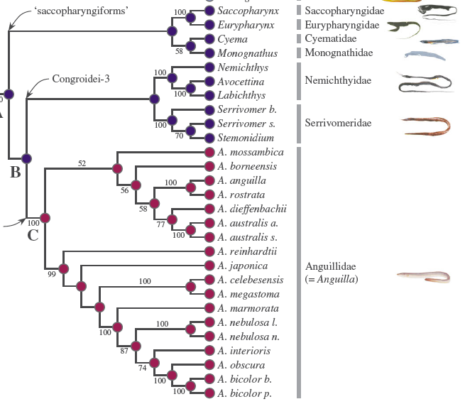 Inoue and colleagues studied the phylogeny of the Angulliformes, better known to you and me as ecstasy gently wrapped in nori, based on the entire mitochondrial genome using 56 representative taxa representing all 19 families. The higher level classification of the eels is way polyphyletic (and paraphyletic) and requires serious revision. The real kicker though is that Anguilla, the freshwater eel, is the most derived of the eels meaning it is newest to evolutionary scene, and is nested within a group of deep-sea eels. A screenshot of the relevant portion of the maximum likelihood tree is below. Note at the top, the “saccopharyngiforms” should look familiar to DSN readers. We got the gulper eel, the dragonfish, and below that clade the group consisting of snipe eels. All of those eels with the purple dot in the screenshot below are mid-water species occurring between 200-3000 meters depths. Underneath it all are the freshwater eels.