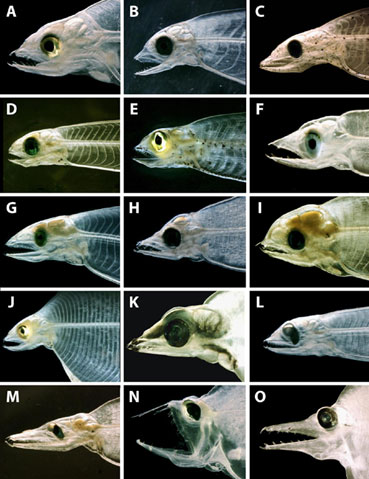 - Larval eel jaw diversity from Michael Miller 2009 ASMB 2(4): 1-94.