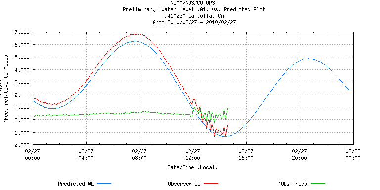 2) The SoCal tide gauge. This is data from the tide gauge on the Scripps Institution of Oceanography pier in San Diego, CA, where I am a student. (Thanks to James Means for emailing it out). The blue line is predicted, the red line is observed, and the green line is the different between the two. See all those squiggles? That’s the tsunami waves hitting the pier! Fortunately for me and the rest of SoCal, the amplitude is less than a foot, and is dwarfed by the normal tidal variation. (Damn you, global draining!)