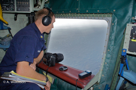 Anything from surface conditions to the position of the sun impact the spotters’ ability to detect oil on the surface. But the Coast Guard employs a range of tools to spot oil- eyes, cameras, radar, and infrared. MST 1 Aaron Hemme, a marine science technician, spent the entire flight at one of the aircraft’s two observation windows, armed with a GPS, camera, and clipboard to mark his observations. GPS location information is recorded of where the oil is, the type of oil, its color, and a description as to whether it is alight sheen or a heavier patty.