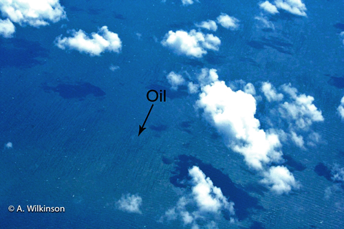 We boarded the C-130 and headed up the coast to Pensacola. Upon reaching Pensacola, we climbed from 1,000 feet to 17,500 feet. About 30 miles south of Pensacola, we saw the first ribbons of oil, something called transparent sheen. Sheen is a thin layer of fresh oil that may be transparent, rainbow, gray, or silvery in color. Transparent sheen, as the name implies, is one of the hardest to spot because it is the same color as the surrounding water. In the photo, ribbons of transparent sheen are visible just off the Chandeleur Islands, and resemble cat scratches on the water’s surface.