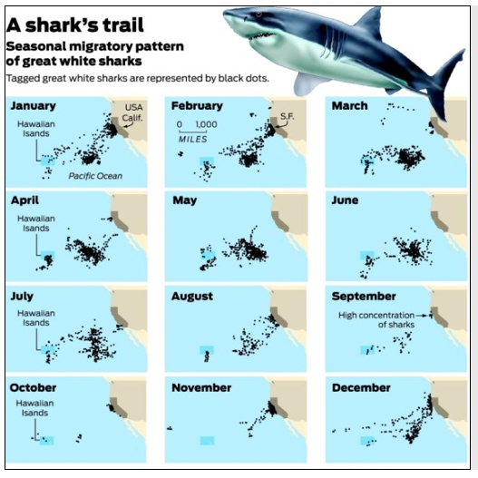 John McCosker, legendary shark expert and chairman of aquatic biology at the California Academy of Sciences has been following the comings and goings of Bay Area great whites for over 30 years. When he started, not much was known about them except what was blared across newspaper headlines whenever a human was attacked. Over the years, McCosker has assembled a fairly complete picture of our annual shark-a-palooza. The graphic to the left illustrates the seasonal flash mobbing by great whites along the northern California coast.