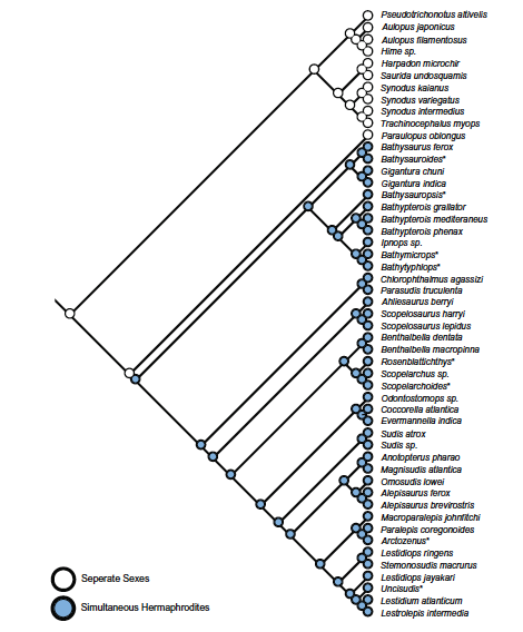 Life in the deep can be total @#$%. No light, cold temperatures, a lack of food, extreme pressures indicative of this remote habitat all select for creative strategies to survive. In deep-sea fish, bioluminescence attracts scarce mates and prey. Large mouths with dagger-like teeth ensure prey don’t escape. Modifications to eyes allow for the detection of faint and residual bioluminescence. Containing both male and female parts ensures all encounters with a member of the sames species result in hanky panky. But when and how many times did these curious novelties arise in the evolution of lizardfishes?