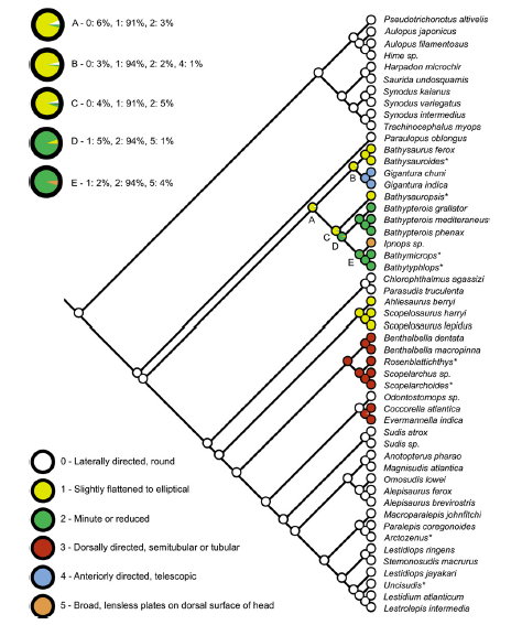 On the other hand the evolution of different eyes types was much more twisted. Elliptical or slightly flattened eyes evolved twice as well as up-facing tubular eyes. All these adaptation arose from an ancestor with round and sideways facing eyes. Telescopic front facing eyed fish, as wells as reduced eyed fish, arose from the elliptical or slightly flattened eyed ancestor.