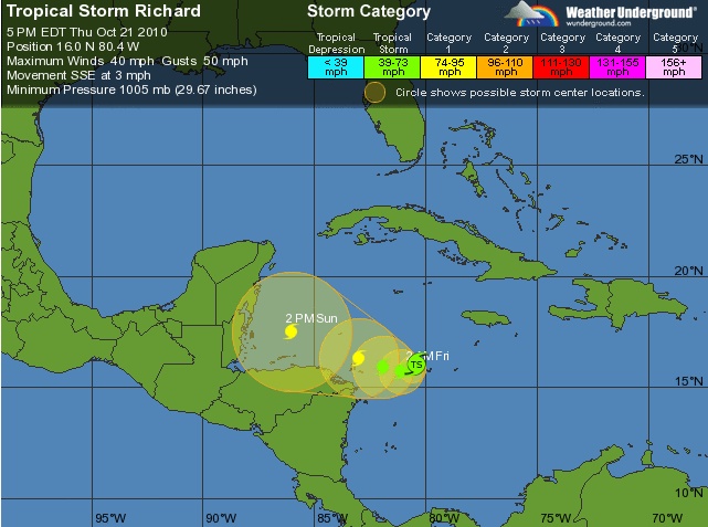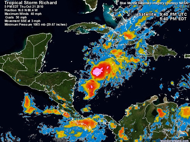 Meet Tropical Storm Richard, currently vexing me at 16.0N, 80.4W, approximately 235 miles SSE of Grand Cayman. Richard has maximum sustained winds of approximately 40 mph and is crawling towards the Honduras Bay Islands at 3 mph