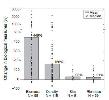 a global synthesis, a meta-analysis of 149 peer-reviewed scientific publications published between 1977 and 2006 of 124 different marine reserves located in 29 countries, demonstrated that the abundance, diversity, biomass, and size of fishes, invertebrates, and seaweeds increase dramatically (sometimes increasing 10 or 20 times) inside marine reserves.