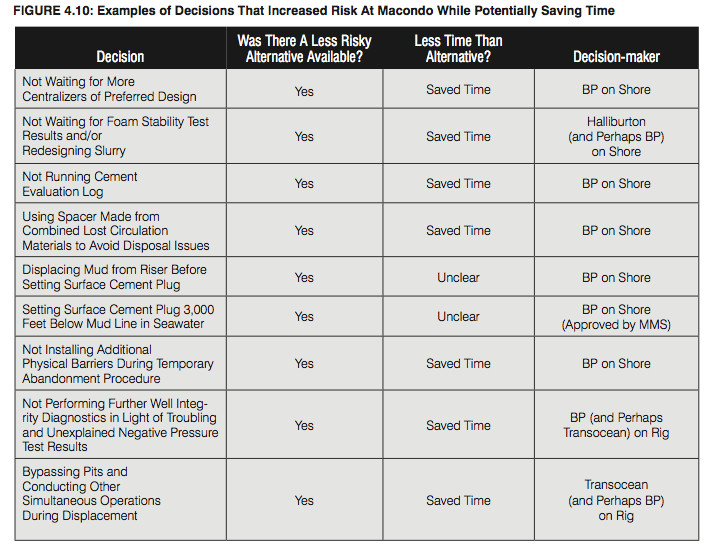 “Whether purposeful or not, many of the decisions that BP, Halliburton, and Transocean made that increased the risk of the Macondo blowout clearly saved those companies significant time (and money).”