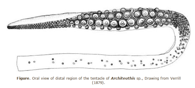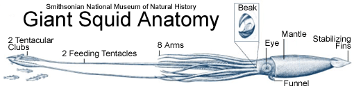 The anatomy of Architeuthis is nothing short of awesome. The key features of the Giant Squid, besides its size, are small ovoid fins at the end of body, i.e. mantle, eight very long arms, two exceptionally long tentacles, and a distinctive tentacular club structure. A tentacular club is the end portion of the tentacle that is expanded, usually covered in suckers, and used for grasping. The tentacles have 4 rows of suckers and divided into three distinct regions. The arms are covered in 2 series of suckers. With regard to the suckers, they are shaped like a suction cup on a stalk. The perimeter of the sucker is rimmed with a sharply toothed ring of chitin. These can cause quite a nasty cut and several sperm whales bear the marks of the Giant Squid. Tentacular clubs with chitin ringed suckers is a scientific recipe for awesome.