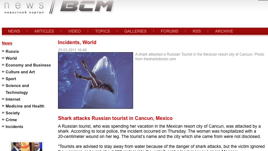 In Late March, a Russian woman received a 20 cm bite on her leg after allegedly disregarding lifeguard warnings to stay out of the water after sharks were sighted in the surf in front of another Cancun resort hotel. Various reports have circulated indicating that despite warnings the woman returned to the water in an attempt to capture a photo of the shark. A Cancun local I spoke to about the incident while in Mexico said that the woman may have gotten caught between the shark and a lifeguard JetSki being used to “herd” the shark away from the shore. Culpability aside, media latched on to this latest “attack” and Cancun, a global tourism destination, was under scrutiny to take proactive steps to combat this “wave of shark attacks.”
