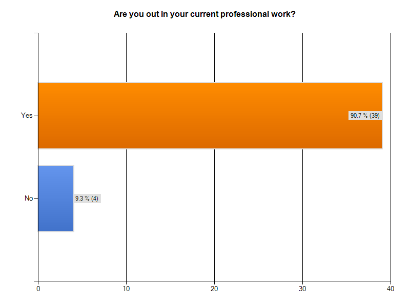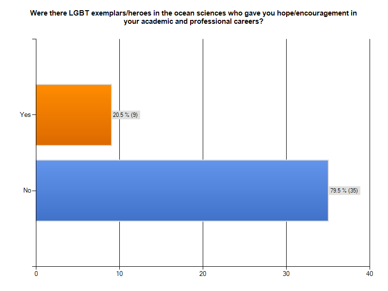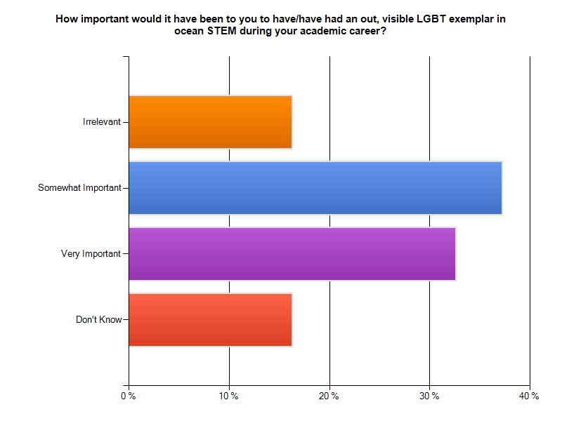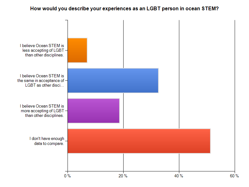 My initial take on the results is that instances of harrassment or intimidation directed at individuals perceived as being LGBT were not a common thread either in answers to questions or through elaboration in comments. The overwhelming majority of respondents identified as being out both during their undergraduate/graduate academic preparation as well as in their current professional careers (which in itself seems a positive sign). Being good scientists, quite a few respondents availed themselves of the “Not enough data to compare” option in answering some questions. Still, respondents seem to perceive ocean STEM areas as about the same in (and perhaps slightly more) accepting of LGBT people. Respondents also indicated that having out and visible LGBT exemplars in ocean science during their academic careers would have been important and presumably helpful.