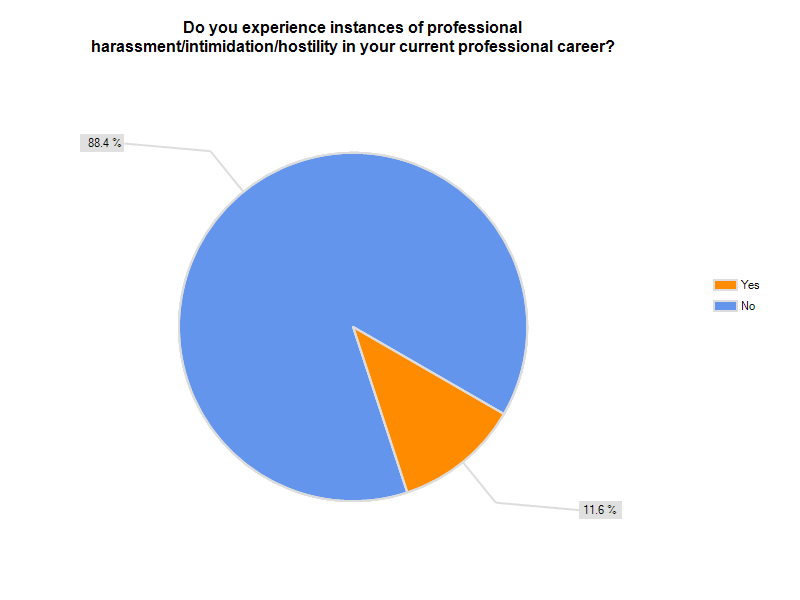Since the survey was designed to be brief and relatively painless, I did not provide an opportunity to cross reference questions for deeper analysis. If I were to conduct a follow-up, I’d want respondents to unpack their answers a bit more to understand what instances of acceptance or harassment looks like in order to get a clear picture of the social climate respondents are describing. And I think you will find the optional comments provided a more personal (and at times emotional) counterpoint to the multiple choice Likert-type questions.