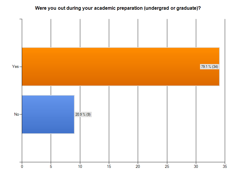 Came out my senior year of college and thus have been out for my entire graduate program (I’m in my 5th year of a PhD program).
