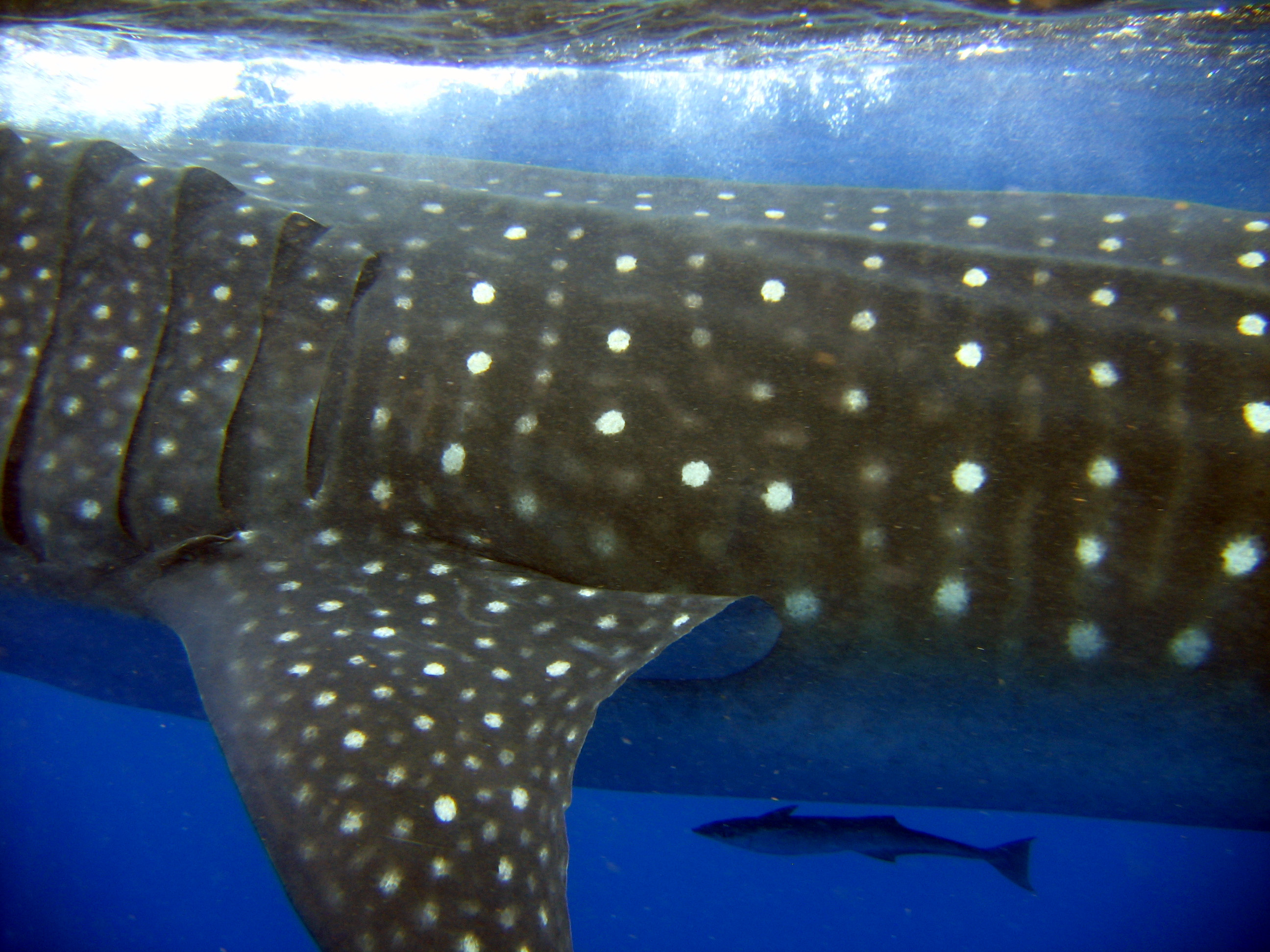 1. You photograph the left flank of a whale shark, in the area above the pectoral fin, level and perpendicular with the animal, thus: