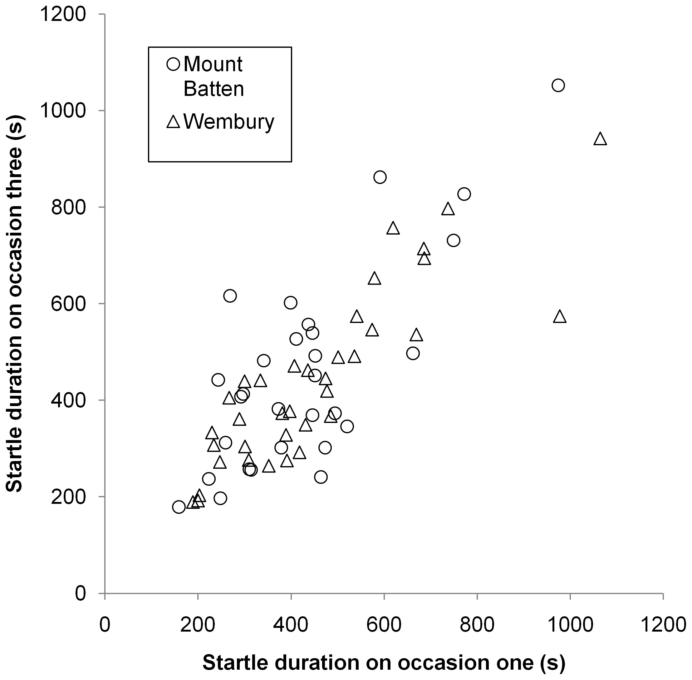 The strong positive correlation between individual startle response durations obtained on occasions one and three at the two study sites.