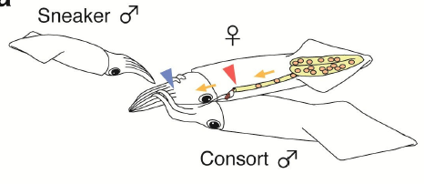 But maybe you’re not a consort male and have your small squid ass handed to you on platter all day long. Never despair! You are the sneaker male! A sneaker male rushes to the female and her consort then mates with the female head to head. Yeah baby stare into my alluring squid eyes. F you big consort squid and F your Marvin Gaye. During this tryst, the sneaker male places his sperm packets near the seminal receptacle.