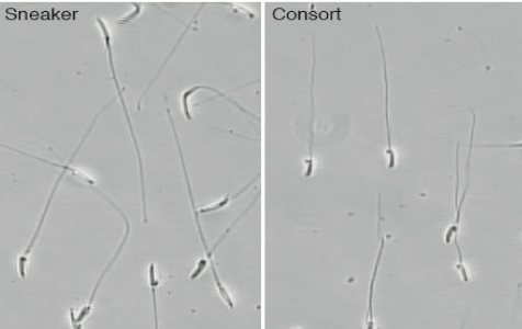 An obvious advantage goes to the consort because of the proximity of his sperm to the eggs. But sneaker males up the ante for the game by producing huge sperm over 30% larger than consort males (above photo). Why? You might guess this is because brawny sperm could outcompete their scrawny competitors. But no difference in sperm velocity is seen between sneaker and consort males. For you information, their sperm swims at about 1/3 a mile per hour. The larger sperm size of sneaker males is likely related to the environment of the external fertilization conditions. A larger sperm may be better able to swim in viscous environment or may need to be larger to hold more mitochondria (the power generator for cells) because it needs to cover more swimming distance to eventually reach the egg.