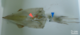 Female Bleeker’s squids can recieve sperm either in a seminal receptacle (location marked by blue arrow above), a specialized sac for holding sperm near her mouth (yes you read that right) or an internal oviduct (red arrow), the tube by which the egg passes from an ovary, behind her head. If you’re a big male and fight off the all other big males, you’re crowned the consort male! As a consort male you slide along side the female, put on some Marvin Gaye, and place your packets of sperm directly into her oviduct. At this point you guard her. She may interpret this as snuggling. This is a win for both of you. You’re ensuring no other males can mate with her until she spawns.