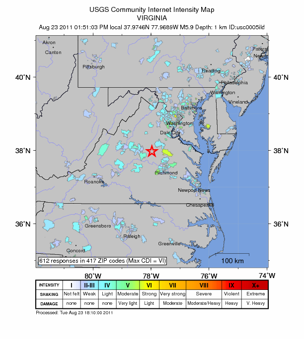 In case you haven’t heard a 5.9 earthquake hit Virginia just outside of Richmond. I felt it in Durham, NC and Kevin felt it out on the coast.  Reports from Twitter indicate it was also felt up in Boston.  If you felt it, you can log into the USGS website and report your local conditions.  A great use of citizen scientists to collect data that will be of great utility to the USGS.  The above map displays 612 responses so far that begin to indicate how the earthquake dissipated.