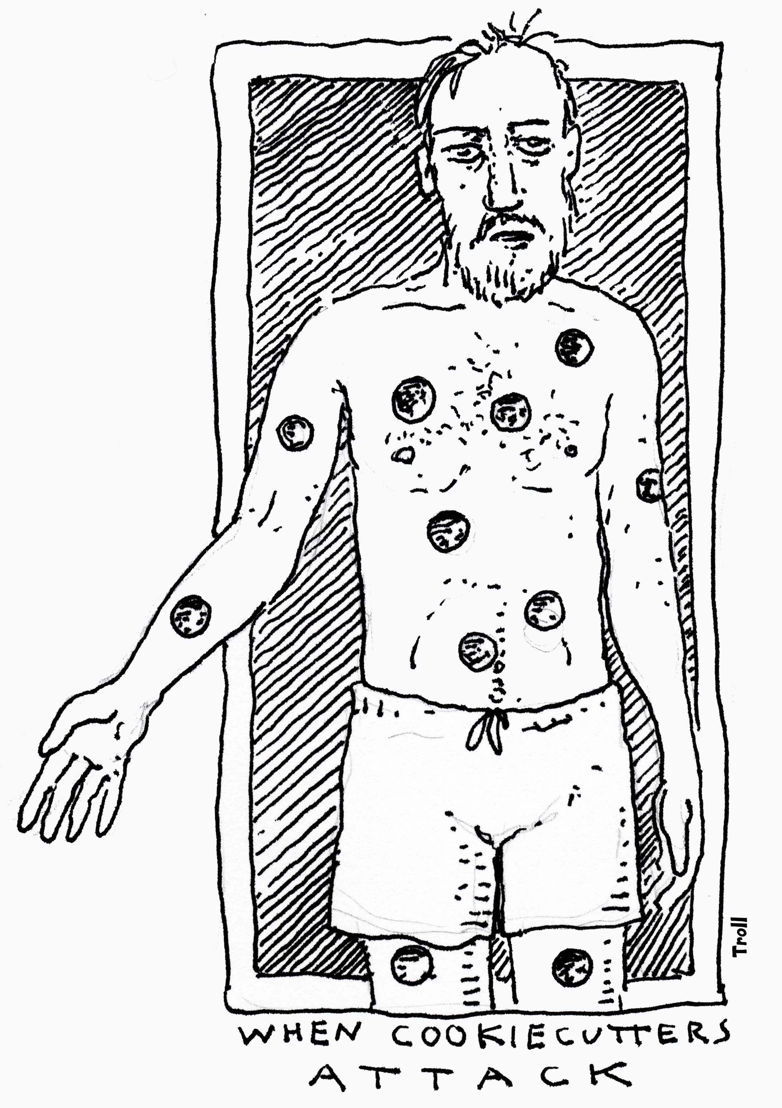 Postscript – through a circuitous email conversation about this post, the most excellent Ray Troll shared a sketch of his, done when he first back in 2001 long before he heard Michael’s story, entitled “when cookiecutters attack”. Ray has kindly given permission for me to share his sketch here – a DSN exclusive! If you’ve been living under a rock and don’t know who I mean, get over to his website, because you’re not really a fish-head unless you own at least one Troll T-shirt! (mine is the classic “Fish Worship – is it wrong?“).