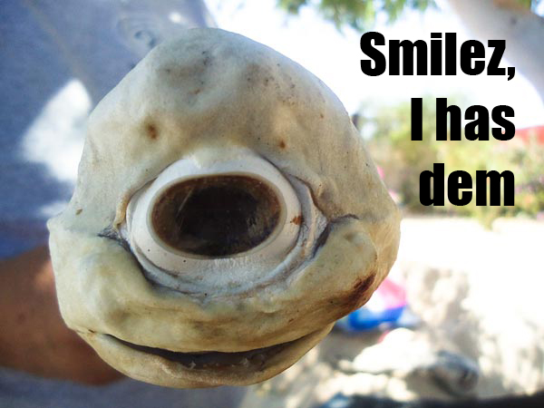 - He looks “right”. At the heart of it, Cyclops shark looks sort of normal, albeit in a highly abnormal way. Unlike so many teratological accidents, he is not a hideously deformed tragedy. That big ol’ eye seems to be roughly correctly shaped and in the “right” place. I mean, if you are going to have half the normal complement of eyes, then right in the middle of the face is about the right place to put it, right? This central location also lends him a sort of frontal “face” that is lacking in other sharks, where you can only see one side of the head (and one eye) at a time. Indeed, he looks kind of sweet with a sort of goofy smile.