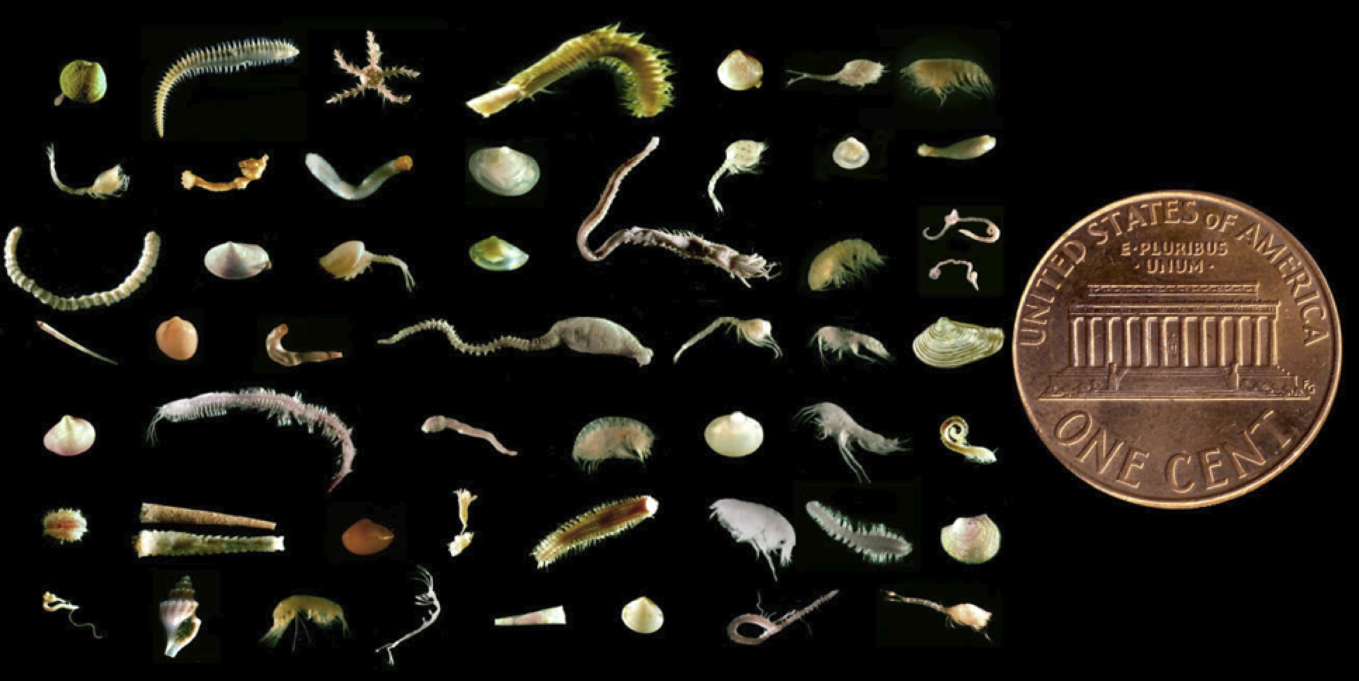 Row 4 scaphopod, bivalve, aplacophoran, long polychaete, cumacean, amphipod, bivalve
