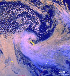 The “I have survived dangerously inclement weather in the name of science” badge. In which the recipient has experience extreme weather hazards, all in the attempt to get data for science. Apparently, they are not technically called hurricanes or cyclones because they’re in the Southern Ocean. The white cross in the satellite image below is the ship I was on.