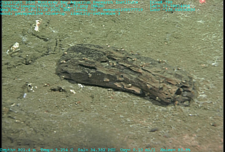 This wooden carcass on the seafloor, called a woodfall, brings shelter and sustenance.  In the deep, devoid of light and plants, a wood carcass also brings a rare commodity—food.  The amount of carbon a tree or piece of wood brings to the seafloor can be anywhere from ten to a thousand times that regularly encountered on the seafloor.  From the carcass comes nourishment to sustain deep-sea life.