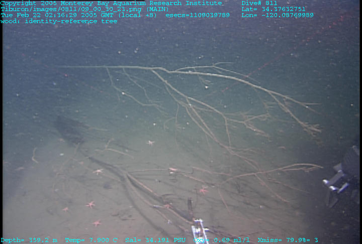 This wooden carcass on the seafloor, called a woodfall, brings shelter and sustenance. In the deep, devoid of light and plants, a wood carcass also brings a rare commodity—food. The amount of carbon a tree or piece of wood brings to the seafloor can be anywhere from ten to a thousand times that regularly encountered on the seafloor. From the carcass comes nourishment to sustain deep-sea life.