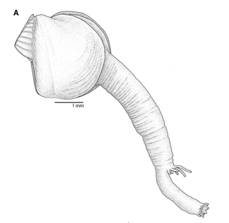 The new species Xylophaga microchira with its muscular foot extended from the shell. Xylophaga uses this large muscular foot to leverage and scrape its beak like shell against the wood. Illustration from Voight (2007)