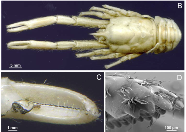 Munidopsis andamanica. Photo C shows the spoon-shaped depression formed by a closed-up claw. In D we see an scanning electron microscope view of the tip of the claw.