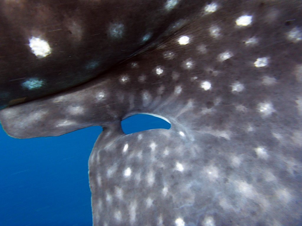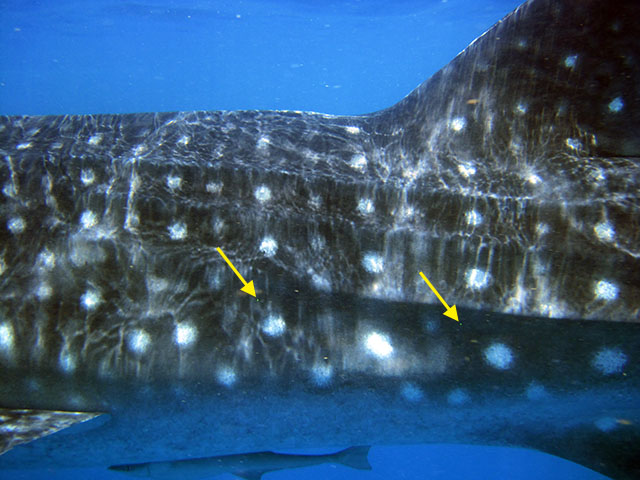 In midsummer 2009, under the intense Mexican sun, a whale shark, MXA-182, arrived at Holbox. He is injured. A nasty cut nearly severs his right pectoral fin. His fin eventually heals, but a hole completely through his fin still persists. The hole’s shape earns MXA-182 the nickname of Keyhole.