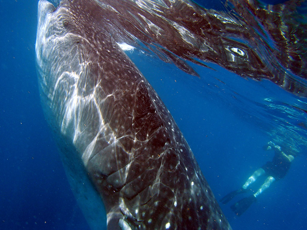 I encountered Keyhole two days ago in my first swim with whale sharks in the wild. I arrive at the Afeura excited and cannot get my mask, fins, and snorkel on fast enough. I toss my self over the port side of the boat. Two strong kicks later and I match Keyhole’s speed but only briefly. For once, and with mixed emotions, I am not the largest vertebrate in the ocean. By eye, I can judge that Keyhole is over three times my own length. The height of his tail fin is taller than myself at six feet. But precisely how large is Keyhole?