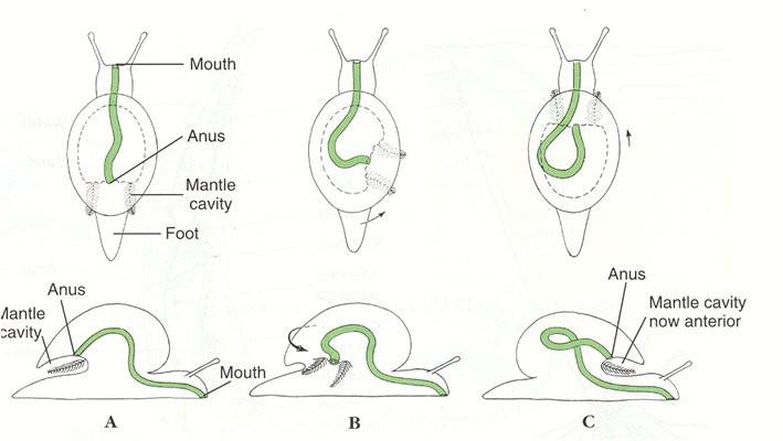 At beginning of a Gastropod’s life, at the tiny larval stage (the veliger), the parts of the body begin to rotate. Not of all them, just the organs for digestion, reproduction, circulation, the shell, and the body wall that covers the former and secretes the latter, twist 180˚ counter clockwise. This process, called torsion, eventually places the organs previously on the right side on the left. The central nervous system becomes a pretzel. Torsion quite literally ties the snail’s stomach in knots with the whole gut eventually twisted into a U-shape. This gut spin also has the unfortunate consequence of placing the anus right above the snail’s head in proximity way to close to the gills.