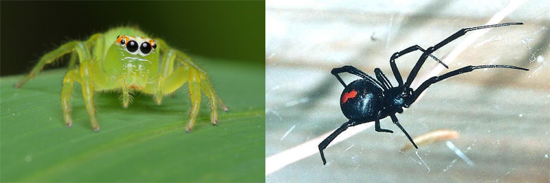 The redback on the right has the unholy trinity – angularity, dark contrasty colours and unpredictable movements. The jumping spider on the left however, almost looks cute, with his gentle lines, mild green colour and big doe eyes. So when people say they are afraid of spiders, what they really mean is that they’re afraid of redbacks and their ilk; plenty of spiders are perfectly innocuous. Indeed, they are not afraid of spiders per se, they are actually afraid of the apparent angularity, darkness and unpredictability of the redback. There is an important difference though. Both the redback and the jumping spider are ruthless predators of insects, but only the redback is dangerous to people, so maybe natural selection was onto something when it hard wired these responses in our brains.