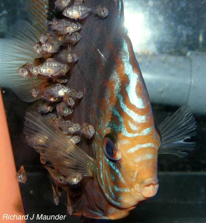 “The highly developed bi-parental care and fry mucus-feeding behaviour observed in Symphysodon spp. is also widespread – at least 28 species have been reported to exhibit fry mucus-feeding behaviour in four families (Noakes, 1979), and this behaviour has evolved many times, in species separated on distant branches of the fish phylogeny, including the Osteoglossiforme Arapaima gigas (Liiling, 1964; Menezes, 1951).”