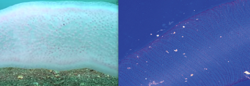 The picture on the left is a close-up of a pyrosome (from this video*). It looks rather sturdy, it has some meat to it, and if you watch the video (starting at 0:10) you’ll see it’s quite robust. The zooids, or little swimming bodies of the pyrosome, are not arranged in nice lines, they’re sort of scattered. The animal itself is not particularly see-through, though it’s a little bit transparent. The picture on the right, in contrast, is a close-up of a diamond-shaped squid (Thysanoteuthis rhombus) egg case (which I wrote about here). The egg mass looks quite fragile, it’s almost clear, and there are lots of little pink dots arranged in swirling lines. Transparent, pink dots in long thin swirling lines, fragile in appearance–check check check, and check.